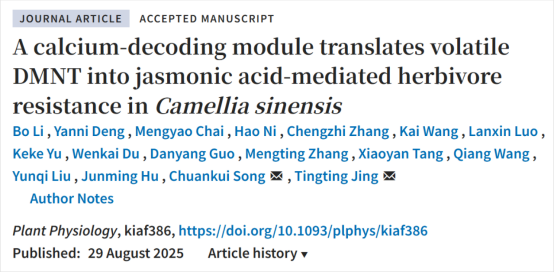 本网讯 近日,我校茶树种质创新与资源利用全国重点实验室宋传奎教授团队在国际著名期刊Plant Physiology上发表题为“A calcium-decoding module translates volatile DMNT into jasmonic acid-mediated herbivore resistance in Camellia sinensis”的研究论文。首次揭示茶树释放的挥发性物质(E)-4,8-dimethyl-1,3,7-nonatriene (DMNT)可作为一种信号分子,触发茶树叶肉细胞Ca2+内流,通过激活Ca2+-CAMTA3-WRKY70-LOX3信号级联,促进茶树茉莉酸(JA)积累,最终增强受体茶树先发制人的抗虫能力。该研究不仅丰富对植物-植物 “化学通信”理论的认知,也为挥发性物质在茶园绿色防控中的实际应用提供重要理论依据。