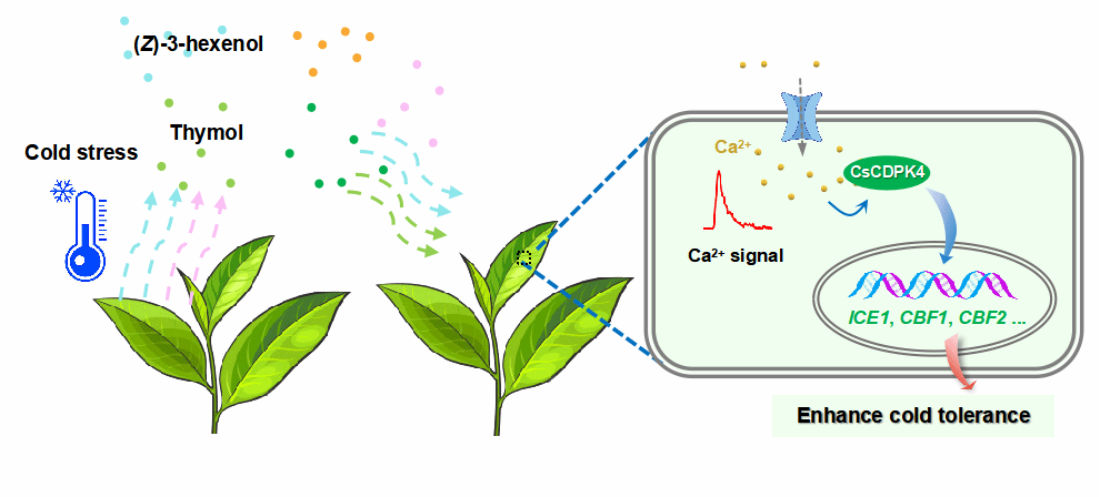 图4. 冷诱导的(Z)-3-己烯醇与麝香草酚增强茶树抗寒能力的机制模型图
