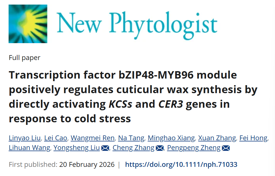 本网讯 2月20日,国际植物经典期刊《New Phytologist》在线发表学校园艺学院刘永胜/郑朋朋团队题为“Transcription factor bZIP48-MYB96 module positively regulates cuticular wax synthesis by directly activating KCSs and CER3 genes in response to cold stress”的研究论文。该研究成果揭示了转录因子bZIP48-MYB96模块通过直接激活KCSs和CER3促进冷胁迫下植物的蜡质合成,从而正调控植物冷冻胁迫耐受。