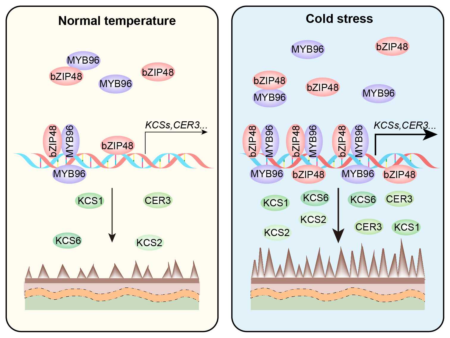 该研究揭示长期的冷胁迫可以诱导拟南芥蜡质合成基因KCSs和CERs的上调表达,促进蜡质的合成和积累,从而增强植物的冷冻胁迫耐受性。该研究进一步发现,转录因子MYB96受冷胁迫诱导上调,负责冷胁迫下的KCSs和CER3基因的激活,以促进冷胁迫下的蜡合成,从而增强植物的抗冻性。此外,研究团队还发现bZIP48与MYB96互作。bZIP48也受冷胁迫诱导上调,并且通过直接激活KCSs和CER3基因正向调节蜡质合成,以增强抗冻性。有趣的是,bZIP48与MYB96之间的相互作用增强了彼此的DNA结合活性,从而协同调控低温胁迫下蜡质的生物合成,提高植物的抗冻性。