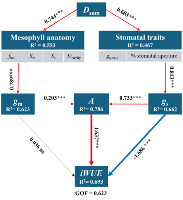研究发现,在正常供水条件下,气孔密度是协调水稻气孔导度和叶肉导度的核心关键性状,其通过调控叶肉细胞排列影响二者的协同变化。高气孔密度虽能显著提升水稻光合速率,但由于气孔导度的提升幅度显著大于叶肉导度,导致水稻内在水分利用效率并未得到改善。