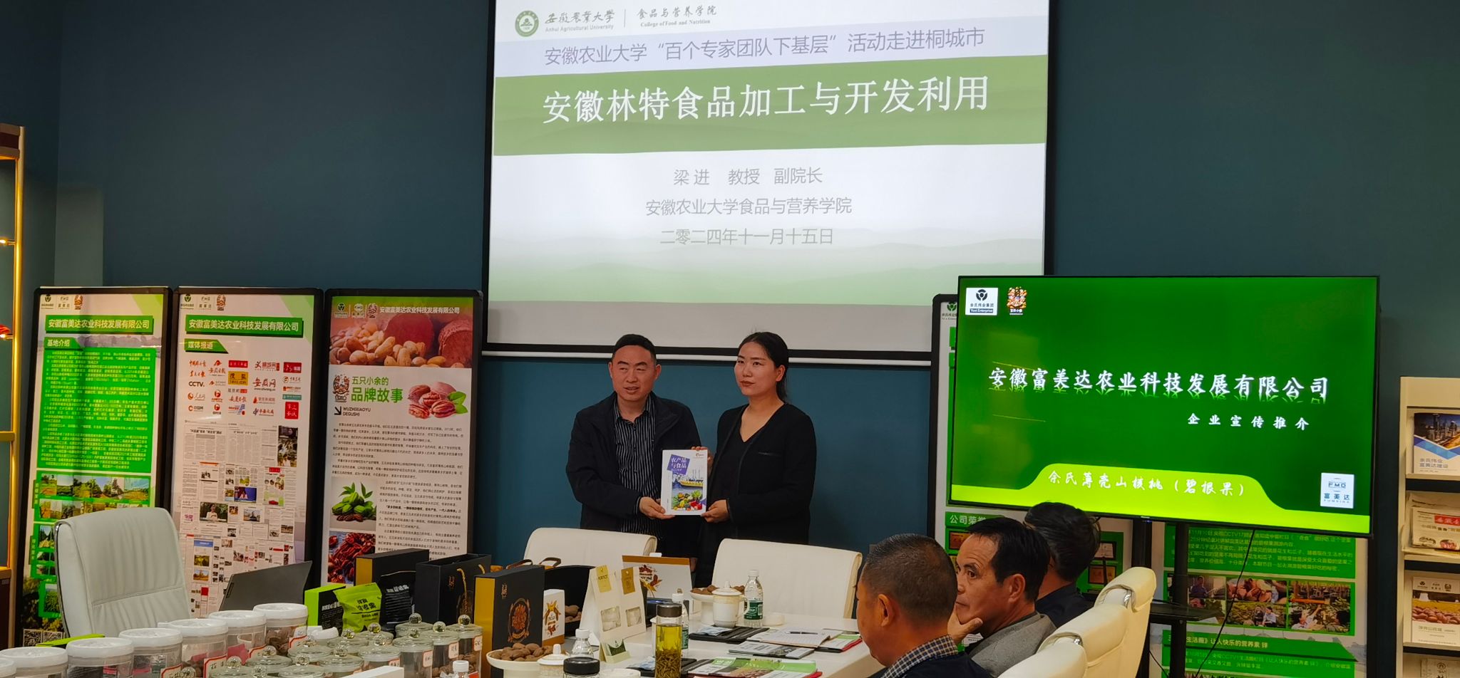 梁进教授发挥专业优势,为安徽林特食品企业在碧根果产品加工与研发技术方面出点子、想法子,并赠送《农产品与食品加工技术》培训教材。