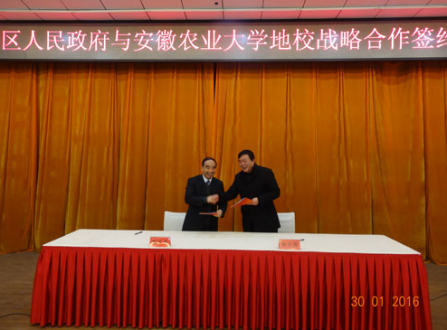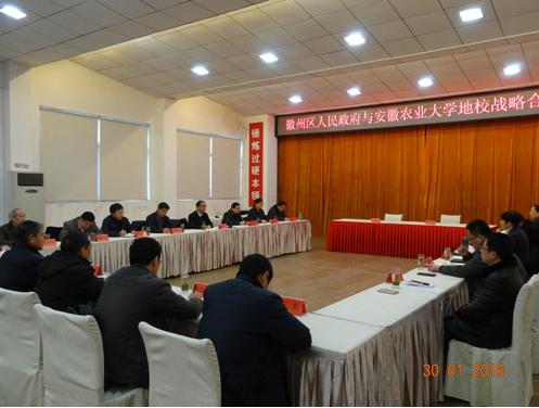 程红、王恒来分别代表区委、区政府讲话。他们表示,感谢学校长期以来对徽州区农业发展的关注、支持,希望借助学校人才、技术和信息等方面优势,以政府为主导,以企业为主体,以具体项目为支撑,提供更加优质高效的发展环境,通过组建农业产业联盟、共建农业创新平台、开展科技服务等途径,力争校区产学研合作早见成效、多出成果。
