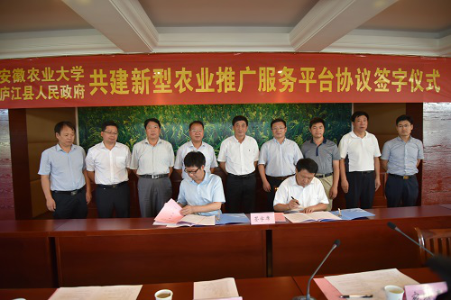副校长姚佐文、庐江县副县长苏少春代表双方签订了《安徽农业大学·庐江县人民政府共建新型农业推广服务平台协议书》。