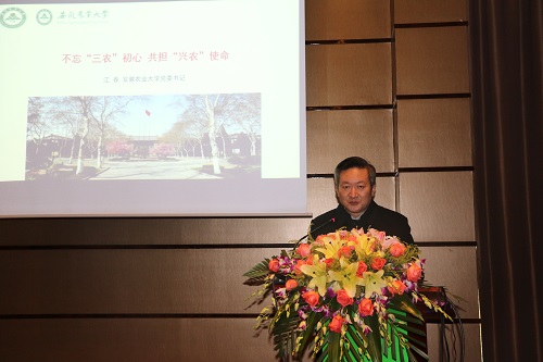 江春书记以“不忘‘三农’初心,共担‘兴农’使命’”为主题,向企业介绍了我校历史沿革和发展概况,指出校企签订战略合作协议是深入贯彻落实党的十九大精神的具体行动、是主动对接“乡村振兴战略”的重要举措、是积极推动安徽省农业农村现代化建设的生动实践,希望双方以此为契机密切合作关系、丰富合作内容、提升合作层次,实现全方位对接、多领域实施、整体性推动。为此,他提出双方要明确合作方向、落实具体项目,细化合作内容、落实具体行动,建立合作机制、落实具体举措,力争双方合作早出成果、早见成效!