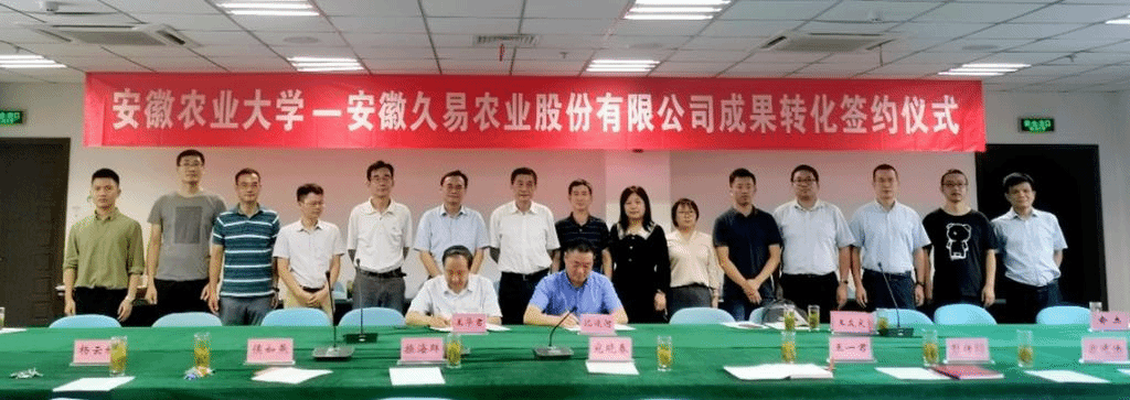 王华君与沈运河共同签订成果转化合作协议。相关老师、安徽久易农业股份有限公司部分代表参加本次仪式。(茶树生物学与资源利用国家重点实验室)