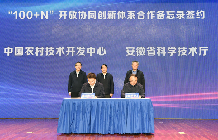 邓小明主任在讲话中指出,习近平总书记和党中央国务院高度重视农业农村科技创新。党的十九届五中全会提出坚持创新在我国现代化建设全局中的核心地位,把科技自立自强作为国家发展的战略支撑,强调要加强前瞻性思考、全局性谋划、战略性布局、整体性推进,优先发展农业农村,实现巩固拓展脱贫攻坚成果同乡村振兴有效衔接。此次与安徽省科技厅开展“100+N”开放协同创新体系建设,正是落实党的十九届五中全会精神,深入推进科技部等7部门关于加强农业科技社会化服务体系建设意见的具体行动。目前“100+N”体系建设进展顺利,态势良好,初步呈现系统引领、资源集聚、行业带动“三种效应”。邓小明强调,面对新形势新任务,在着力推动“100+N”体系建设、打造安徽农业科技社会化服务体系“升级版”过程中,要努力在“四个强化”上下功夫。一是强化协同互动。充分发挥省内各类创新主体优势,开展跨区域、跨领域、跨学科的交流协同,提升创新合作效能。二是强化跨界融合。推动生物、信息、材料等领域新技术新产品与农业融合发展并转化落地,打通科技、金融、产业通道,促进一二三产业融合发展。三是强化重心下移。要把园区和县乡村作为科技服务的主战场,聚焦人才下沉科技下乡服务“三农”,提升基层创新质量和效益。四是强化开放共享。要充分借鉴利用全国范围内“100+N”体系各单位优势,加强模式和经验互通共享。同时,把安徽纳入“100+N”体系的高校、院所、园区、企业、新型研发机构、科技特派员工作站等创新主体建设成为全省范围内的样板,带动同类型其他创新主体提升自身创新能力和水平,引领支撑农业农村高质量发展。