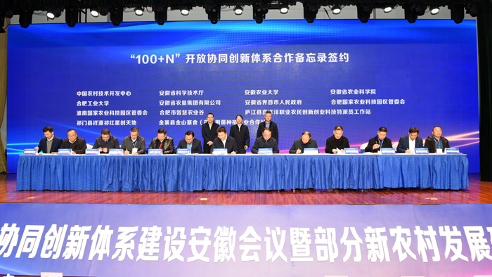 会上,农村中心副主任陈成、安徽省科技厅副厅长姚群签署了《“100+N”开放协同创新体系合作备忘录》,双方与11家安徽协作单位签署了备忘录,这标志着在前期实践基础上,“100+N”开放协同创新体系(简称“100+N”体系)建设在安徽正式启动。双方将立足安徽省农业农村科技创新优势与特色,充分调动安徽省内高校、院所、企业、园区、县市等优势创新力量,以推动创新资源集聚下移、开放协同为目标,促进长三角农业科技创新一体化发展。来自合肥市国家农业科技园区、安徽省农业科学院、安徽省农垦集团有限公司、界首市人民政府、金寨县金山寨食(药)用菌种植专业合作社等5个单位代表就在“100+N”体系下如何立足自身特色,推动农业科技服务创新融合发展的思路举措进行交流发言。我校深化落实合作重点,与4家创新型企业进行了合作签约。此外,我校与浙江大学、西北农林科技大学、沈阳农业大学、华中农业大学等5家高校新农村发展研究院代表围绕新农村发展研究的成果转化和科技服务工作进行了交流研讨。