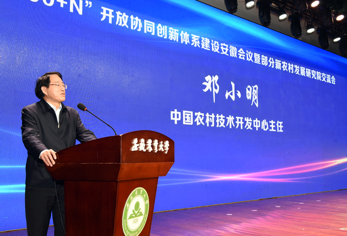 12月9日,由科技部中国农村技术开发中心(简称农村中心)和安徽省科学技术厅(简称安徽省科技厅)共同主办、我校承办的“100+N”开放协同创新体系建设安徽会议暨部分新农村发展研究院交流会在我校图书馆第一报告厅召开。会议旨在谋划新形势下推进农业农村科技创新、推动创新资源集聚下沉,共同探索打造安徽农业科技社会化服务体系“升级版”,支撑引领安徽农业农村高质量发展。农村中心主任邓小明,科技部农村科技司副司长胡益锋,安徽省科技厅副厅长姚群,我校党委书记江春出席会议并讲话。会议分两个阶段进行,第一阶段由安徽省科技厅副厅长姚群主持,第二阶段由我校党委常委、副校长操海群主持。