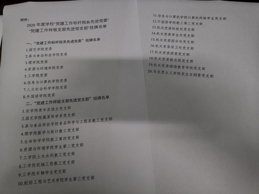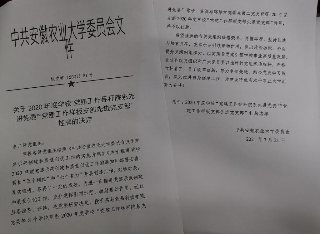 经校党建工作领导小组评议,新农院党支部于2021年7月21日获2020年度学校“党建工作样板支部先进党支部”挂牌。