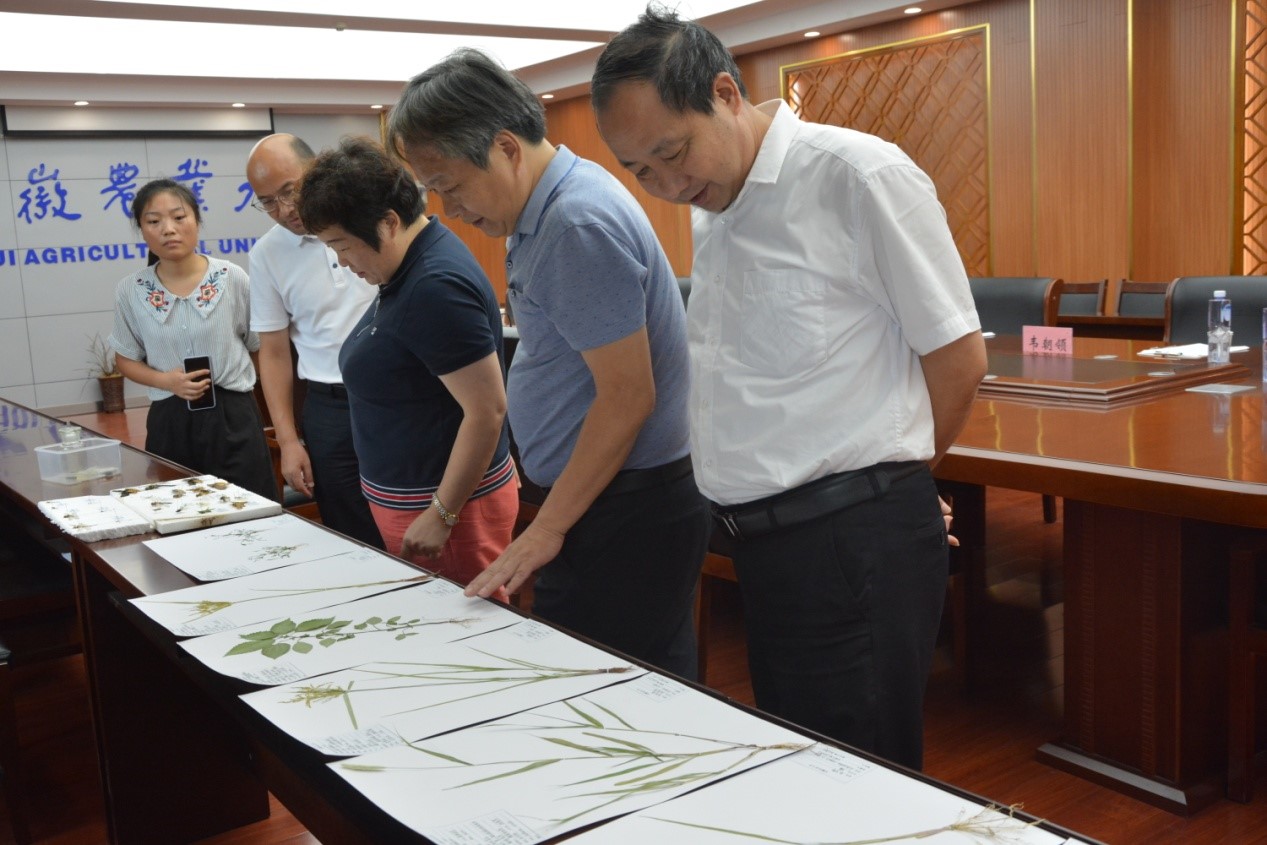 会前,王华君、黄正来、叶秀一行查看了驻站实习学生采集制作的作物病虫草害标本。