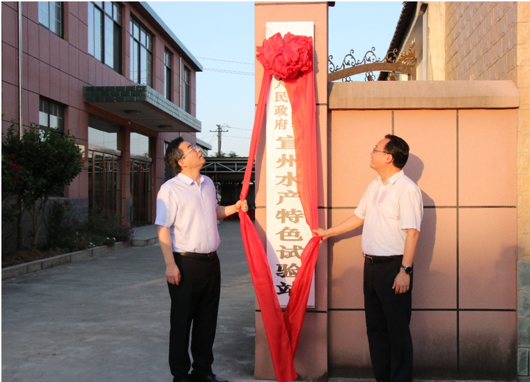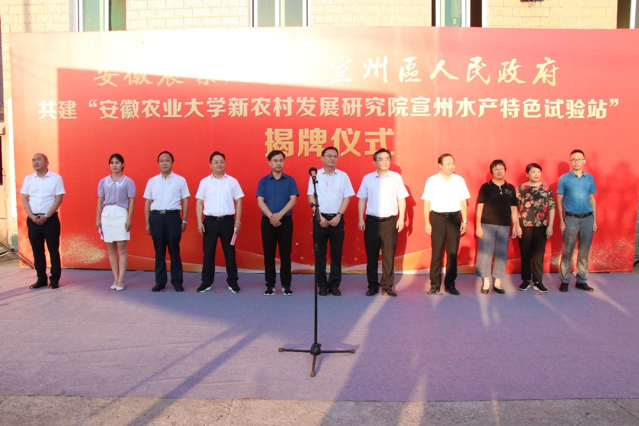 校党委常委、副校长操海群、宣城市委常委、组织部部长朱立军现场揭牌;宣州区委副书记、区长俞志刚致辞;新农村发展研究院常务副院长王华君介绍校区共建宣州水产特色试验站情况。