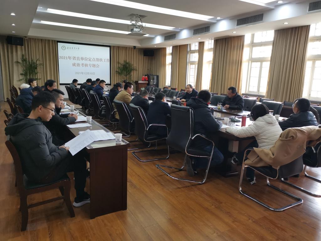 本网讯 为做好2021年度省直单位定点帮扶成效考核迎检工作,同时助力巩固拓展脱贫攻坚成果与乡村振兴的有效衔接,12月10日下午,学校在第三会议室召开定点帮扶工作成效考核专题会。新农院常务副院长王华君主持会议,校帮扶工作牵头单位、责任单位负责人和驻村帮扶工作队队长参加了会议。