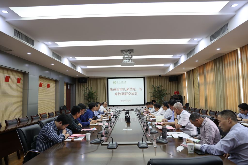 朱浩东对安农大一直以来支持池州市产业发展表示感谢。他介绍,近年来池州市依托优质富硒土壤资源,以富硒为主方向,以粮油、家禽、水产、中药材、茶叶和林木六大特色产业为落脚点,打造“1+3+6+N”融合发展的绿色食品产业体系。朱浩东表示,希望能以此为契机,与安农大展开更深层次、更全方位、更高质量的合作,整合优势资源建立长效合作机制,将具体项目落实、落地,实现共赢。